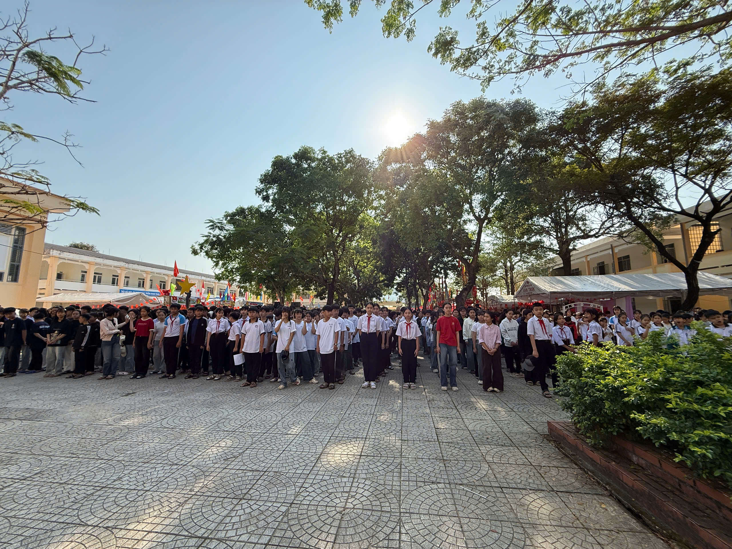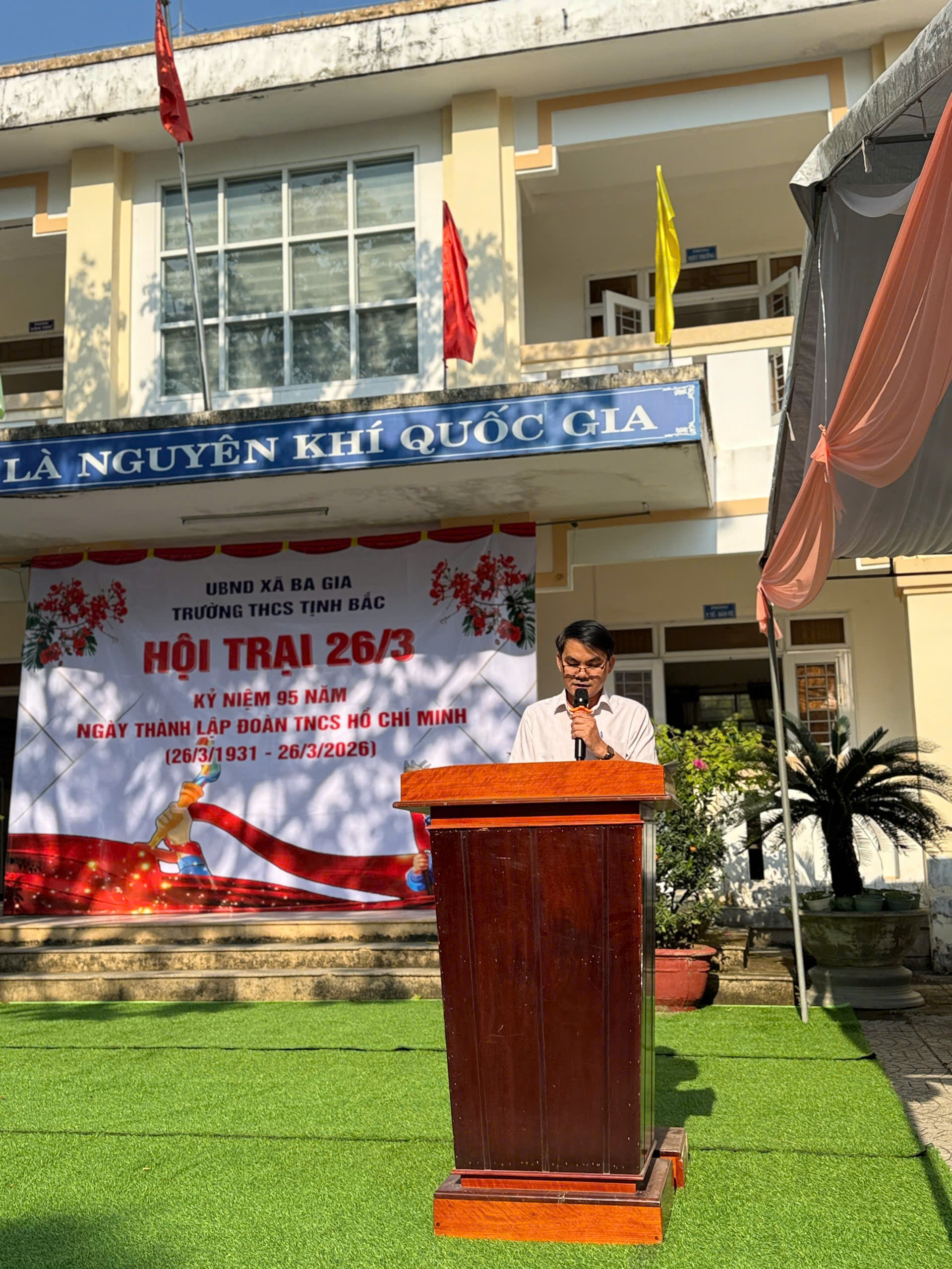 Sáng ngày 20/3/2026, lễ khai mạc hội trại đã diễn ra trong không khí trang trọng và đầy hứng khởi. Tại buổi lễ, thầy Trần Văn Thanh – Bí thư Chi bộ, Hiệu trưởng nhà trường đã có bài phát biểu khai mạc, nhấn mạnh ý nghĩa của hội trại trong việc giáo dục truyền thống, rèn luyện kỹ năng sống, tinh thần đoàn kết và sáng tạo cho học sinh. Đồng thời, thầy cũng gửi gắm kỳ vọng các em sẽ tham gia hội trại với tinh thần vui tươi, an toàn và đạt nhiều thành tích tốt.