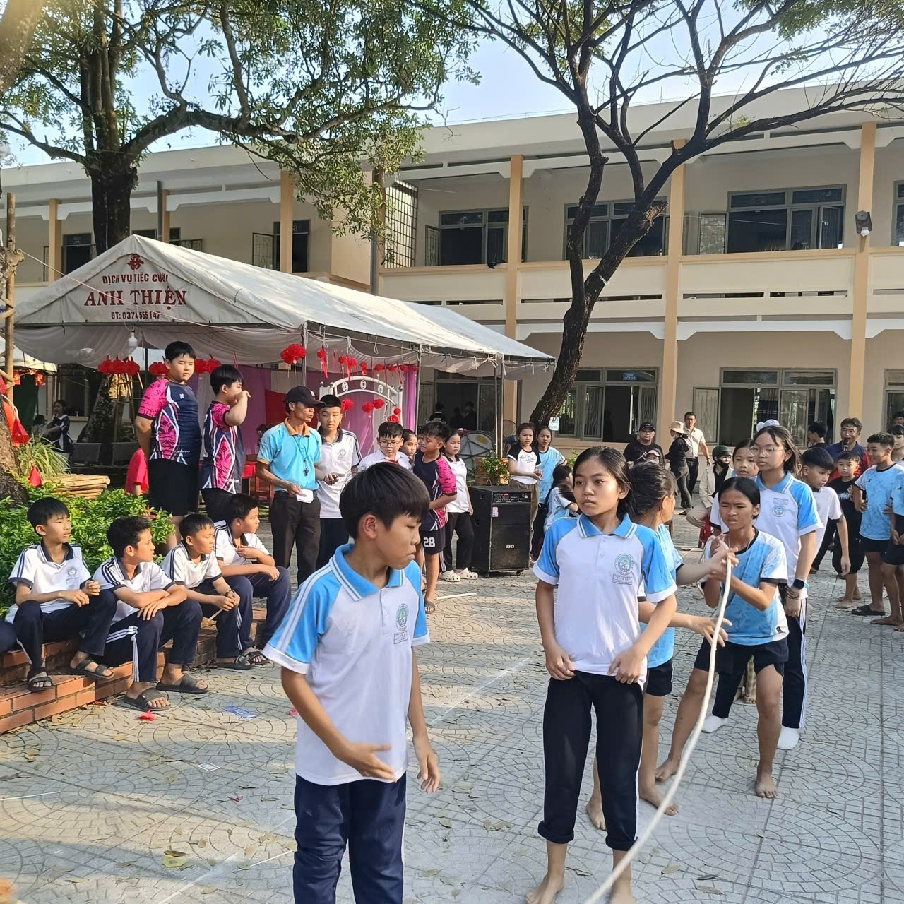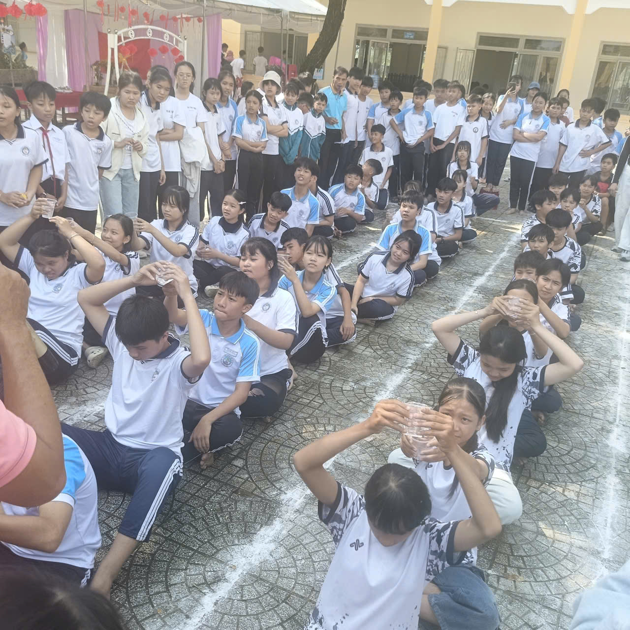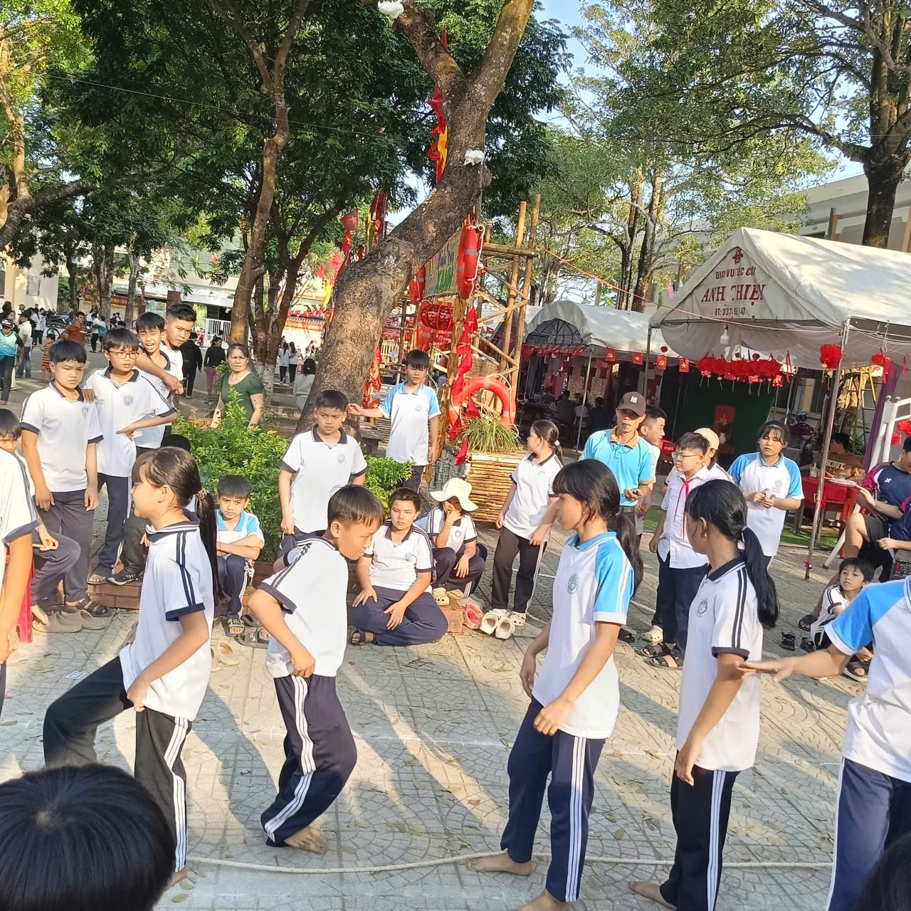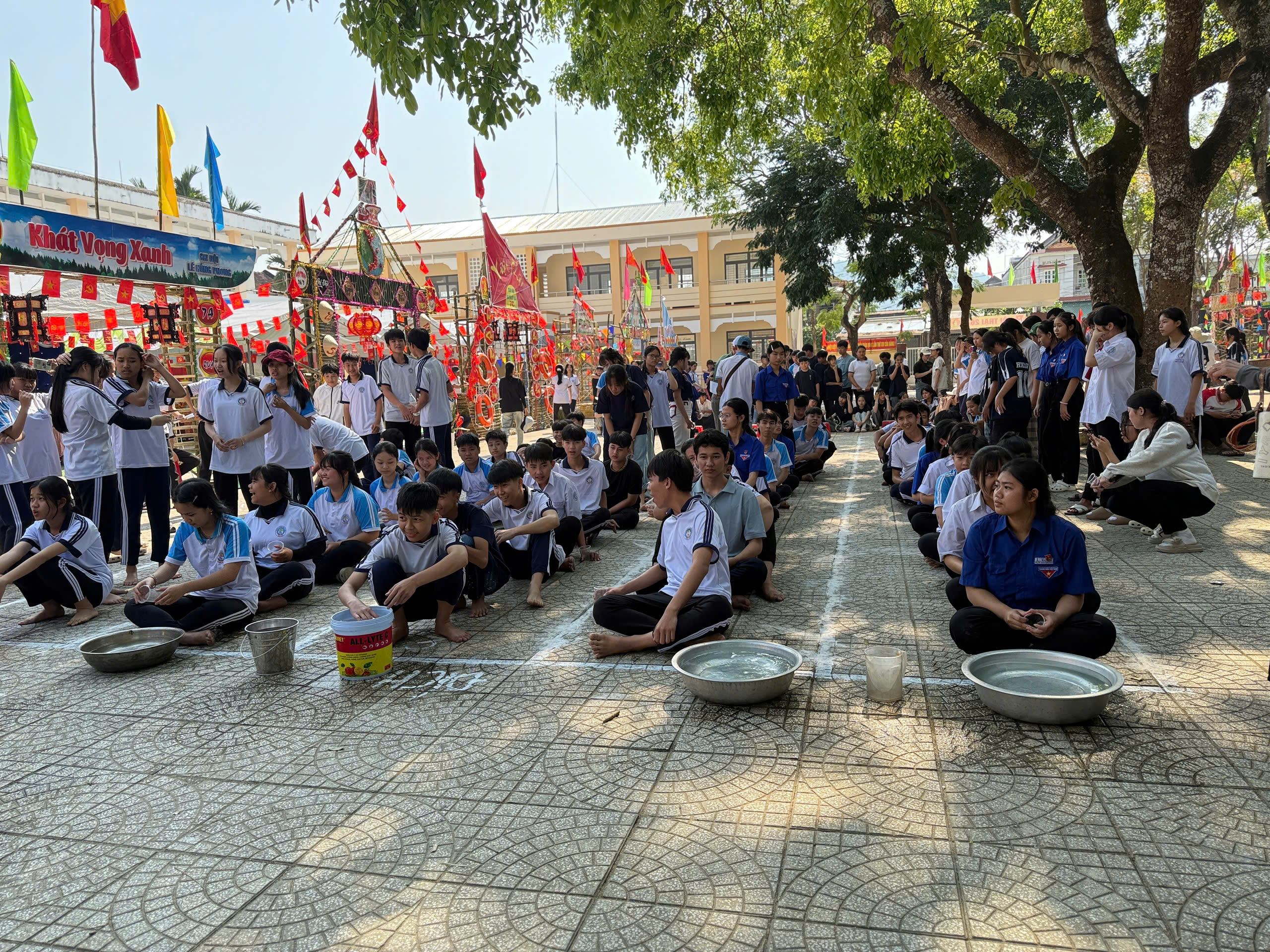 Các trò chơi vận động: như chuyền nước đổ chai, kẹp bóng tiếp sức, nhảy bao bố, nhảy dây tập thể… tạo nên không khí thi đua sôi nổi giữa các khối lớp.